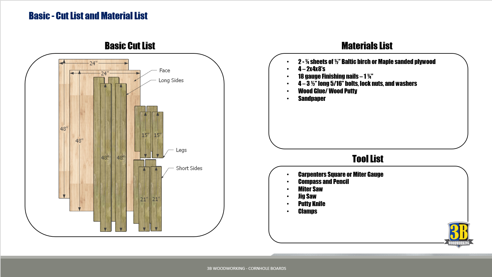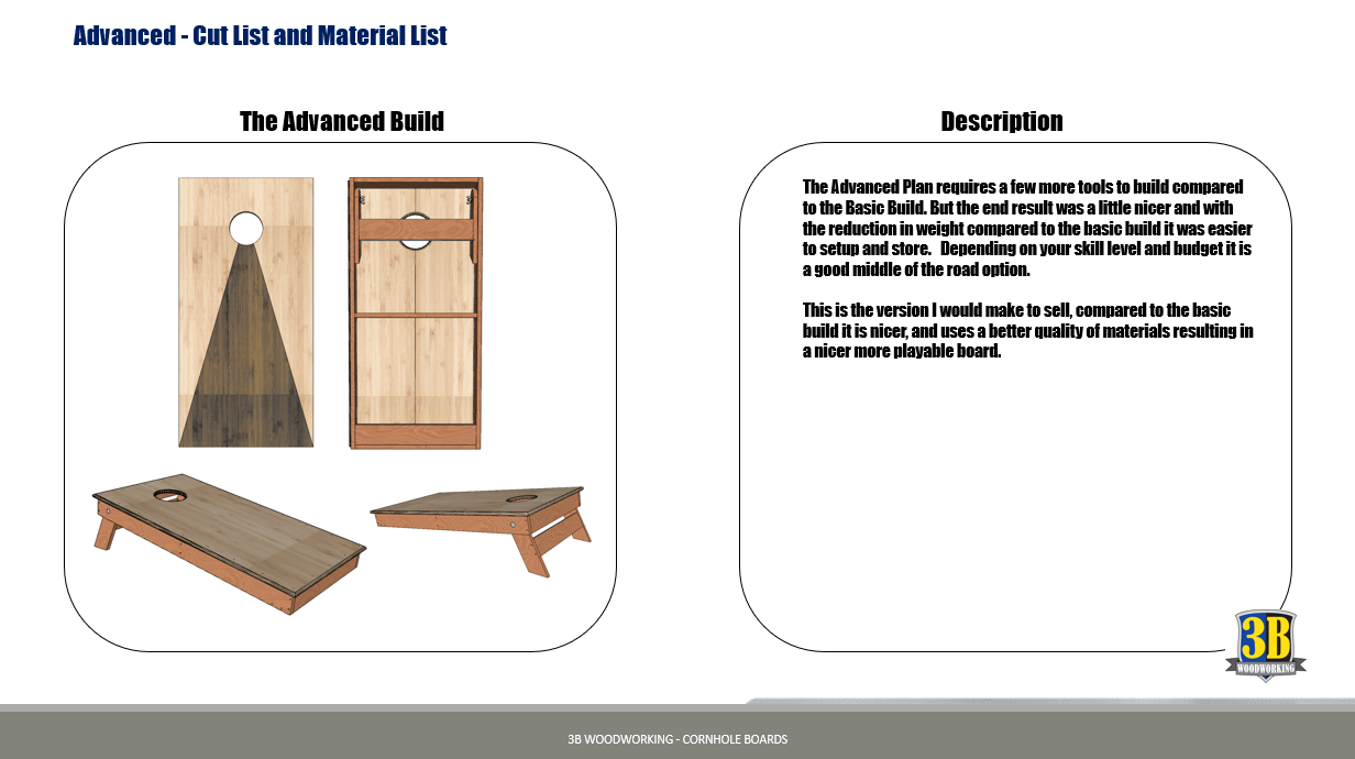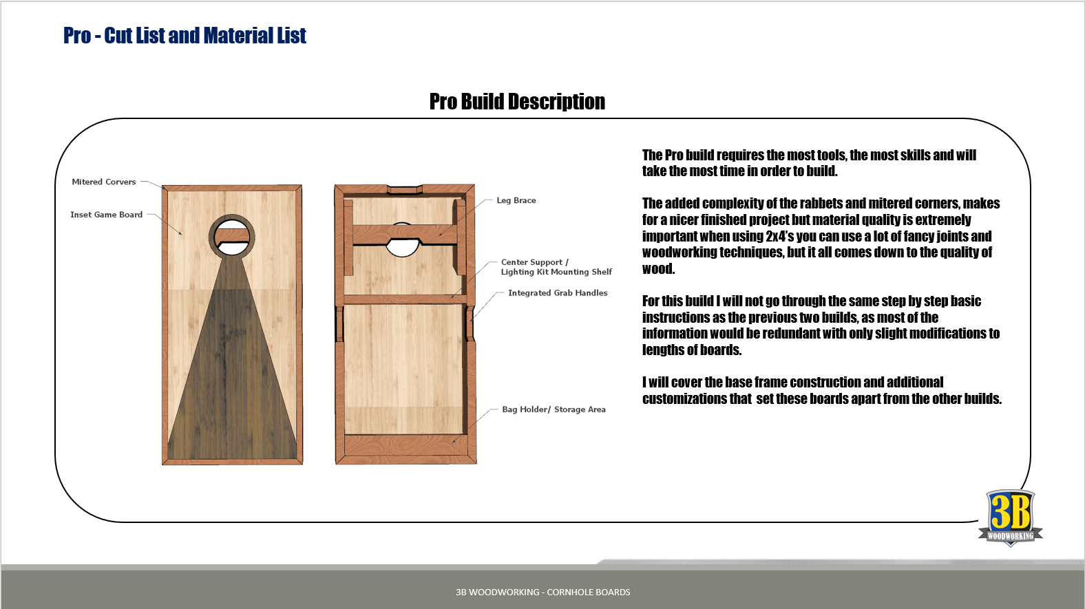 These are three separate step by step build plans to build a set of Cornhole boards. The plans start with the basic build which is the easiest to build and requires the least amount of tools. Then they progress to the advanced build which requires a few more tools and techniques under your belt, all the way up to the Pro build. The Pro build is packed full of features and little details that really make them stand out. In all of these plans i explain the needed tools and materials as well as provide cut lists and step by step instructions in detailed color images.