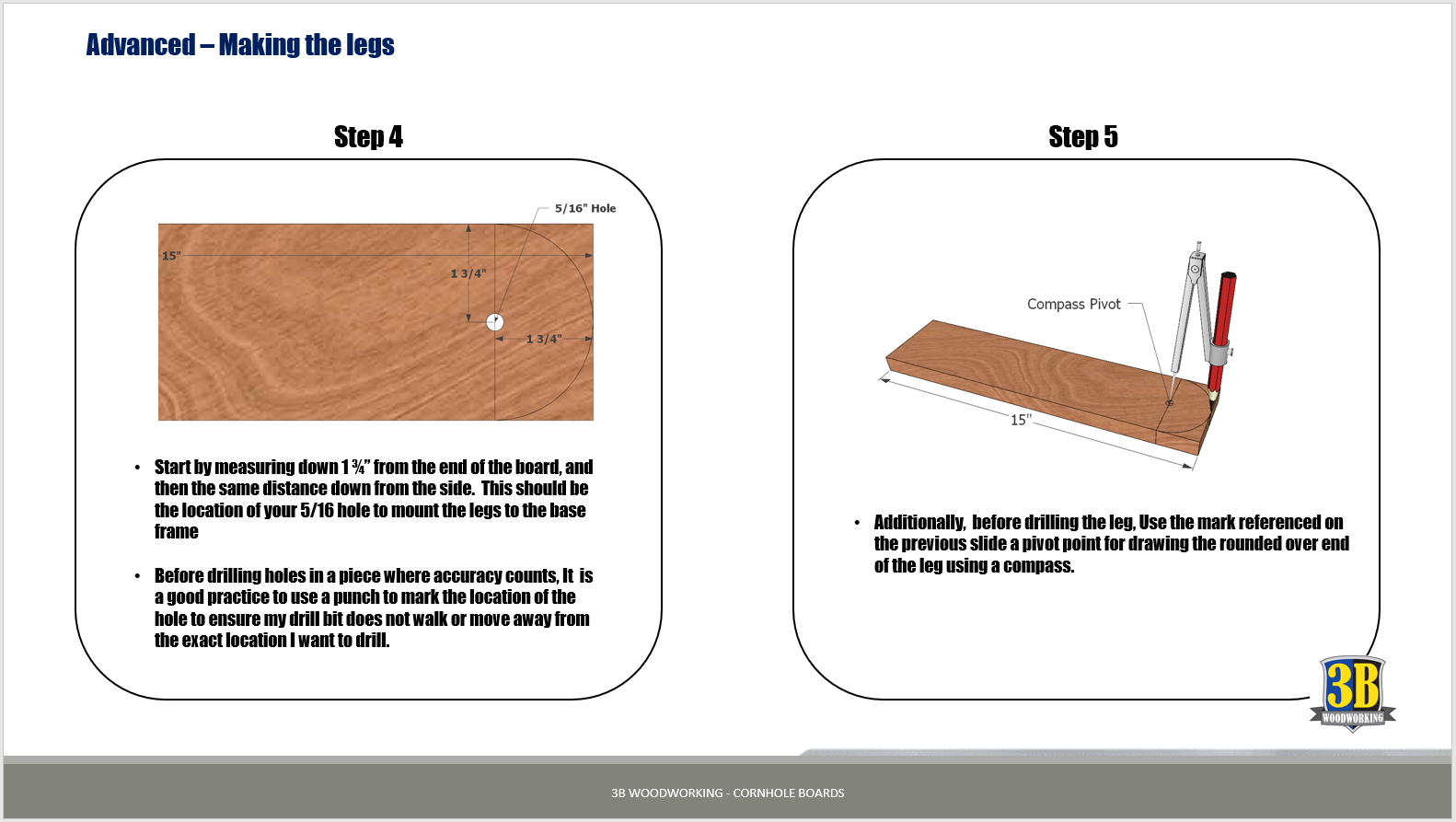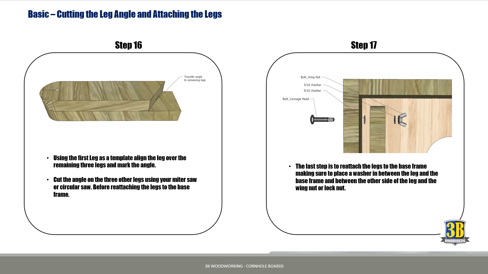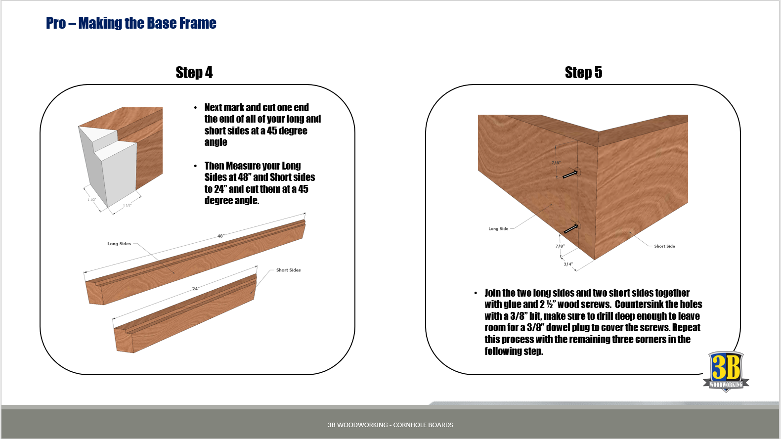 These are three separate step by step build plans to build a set of Cornhole boards. The plans start with the basic build which is the easiest to build and requires the least amount of tools. Then they progress to the advanced build which requires a few more tools and techniques under your belt, all the way up to the Pro build. The Pro build is packed full of features and little details that really make them stand out. In all of these plans i explain the needed tools and materials as well as provide cut lists and step by step instructions in detailed color images.