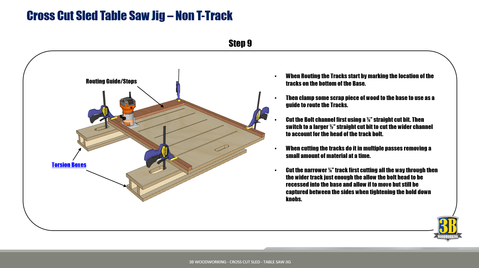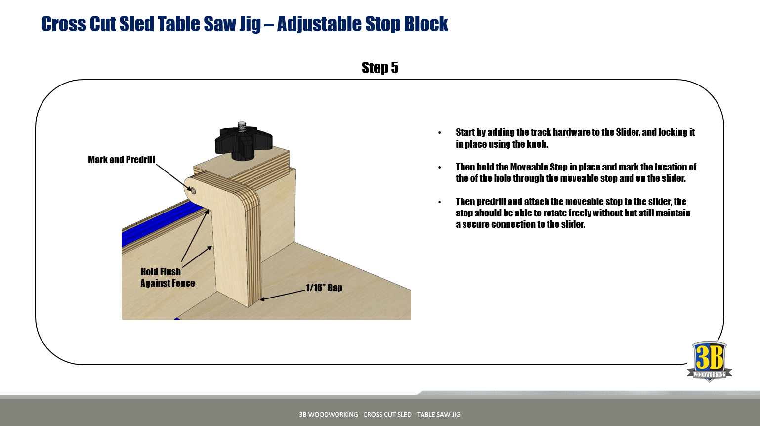 This guide is full of step by step instructions with color images, and detailed close-ups, that walk you through the entire build process to build this useful addition to any workshop. The plan has two versions one with T-Tracks and one without, as well as step by step plans for an adjustable stop and miter attachment.