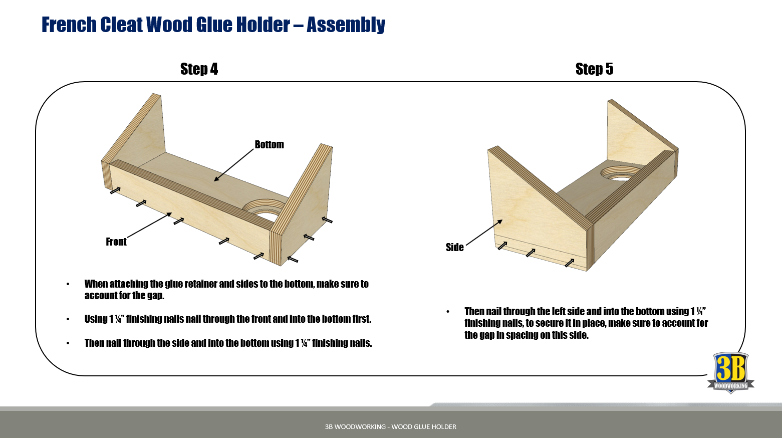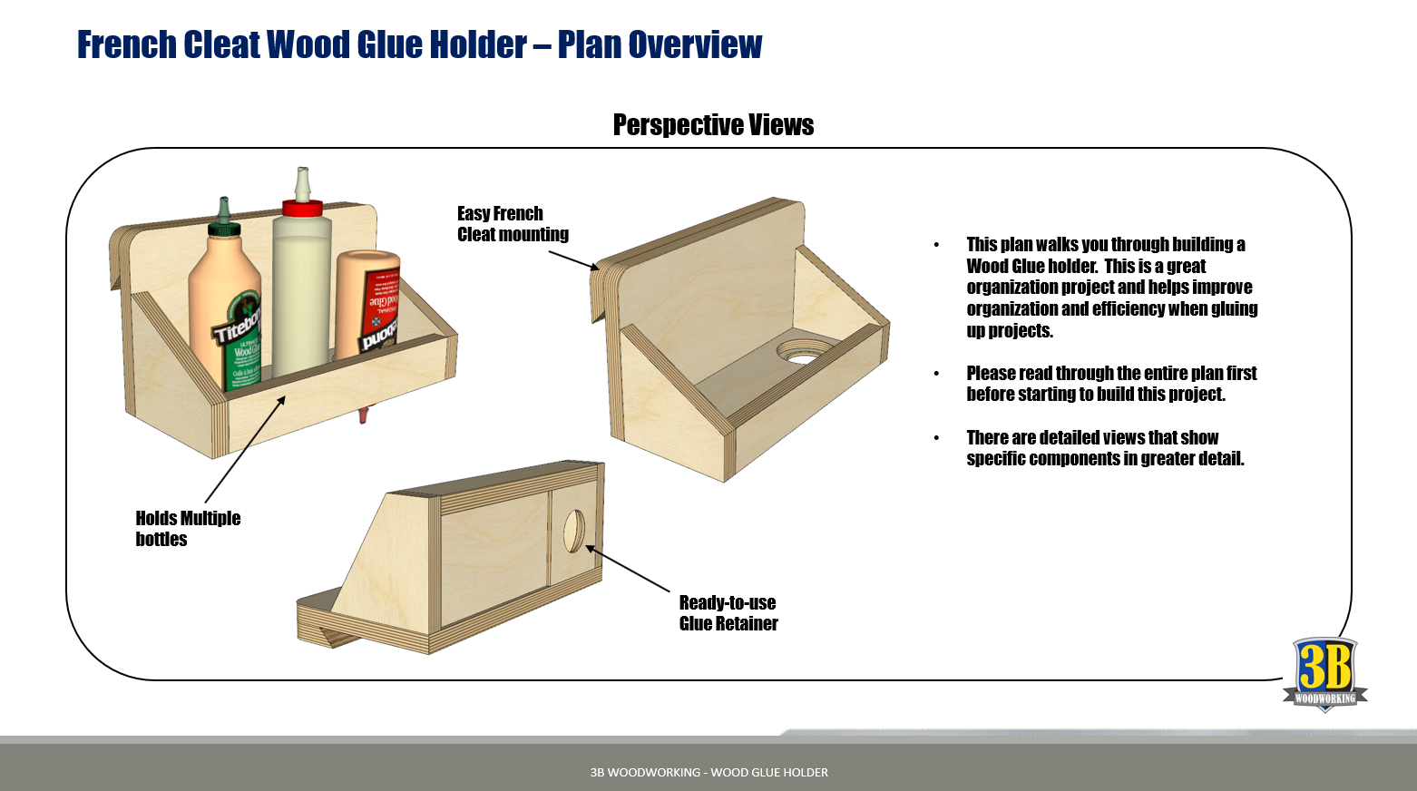 Achieve the flexible shop organization you need in your garage workshop with this wood glue holder. It allows you to easily hold all your different glue’s in one place, and with the ready to use glue holder feature helps speed up your workflow when gluing up woodworking projects.