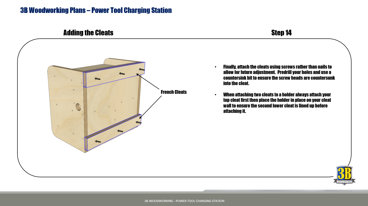 These step by step instructions with color images, and detailed close-ups, walk you through the entire build process to build this useful addition to any workshop. The Power tool charging station itself measures 17″ Wide by 15 1/4 Tall” by 11 1/2″ Deep.