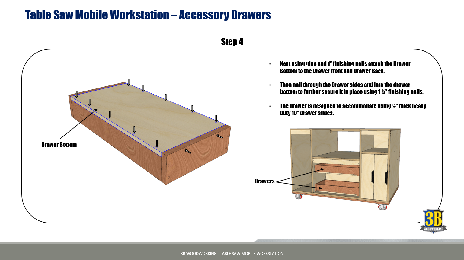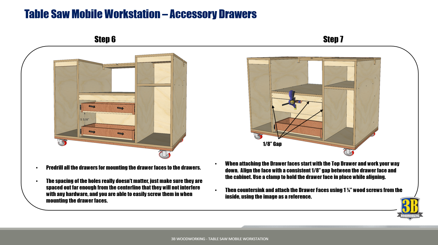 This Table Saw Mobile workstation if the perfect solution to improve your shop organization and provide additional storage and functionality compared to a normal table saw stand. With the addition of the mobile base you can quickly maximize your workflow and move your table saw around the shop easier. The table saw station also provides extra storage with the vertical storage drawers, as well as the accessory drawers. The accessory drawers are great for storing your dado stacks and other table saw related items, This really improved how quickly i could build projects with greater quality.