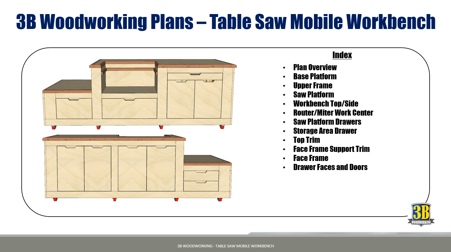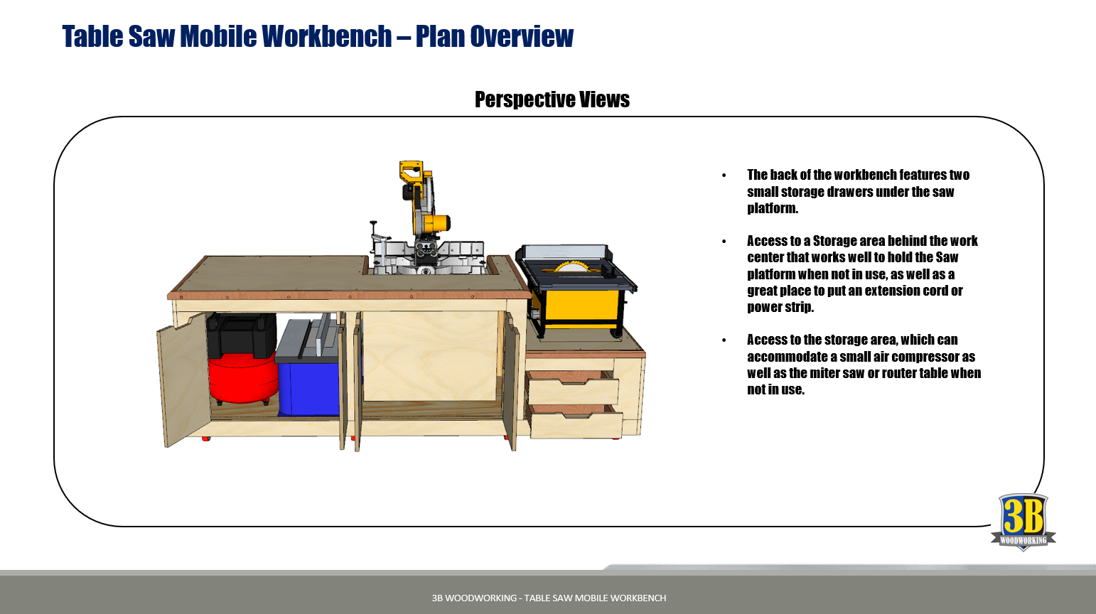 This Table Saw workbench plan walks you through building an amazing mobile workbench. This workbench incorporates your Miter saw, Router Table, Table Saw and even room for a small air compressor all in one useful garage organization package. The workbench is packed with storage and functionality to provide the maximum use of space in your small workspace that easily rolls out of the way when not in use.